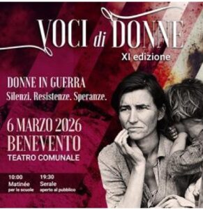 “Voci di Donne” torna per l’11esima edizione venerdì 6 marzo al Teatro Comunale “Vittorio Emmanuele” di Benevento. Il programma della giornata prevede alle 10 lo spettacolo per il matinèe con le scuole e alle 19.30 il serale aperto al pubblico. La manifestazione quest’anno presenta “Donne in Guerra. Silenzi. Resistenze. Speranze.”