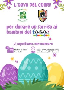 Torna l’appuntamento con la solidarietà firmato CRAL ASIA Benevento. In occasione delle festività pasquali, l’associazione, in collaborazione con il Benevento5, presenta l’iniziativa “L’Uovo del Cuore”, un evento dedicato a donare un sorriso e un momento di gioia ai bambini dell’associazione F.A.B.A. (Famiglie Bambini Autistici).