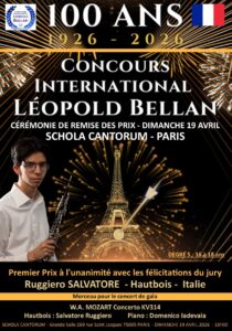 Domenica, 19 aprile prossimo, il giovane e talentuoso oboista di Airola, Salvatore Ruggiero si esibirà a Parigi in occasione della cerimonia di chiusura del Concorso Internazionale “Léopold Bellan”, giunto alla 100a edizione, in programma presso la Schola Cantorum.