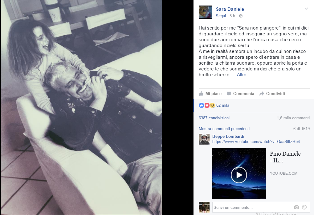 “Nulla si spegne! si accede ad un’altra dimensione, ad un’altra luce a… ‘Tutta n’ata storià!”. È il messaggio pubblicato sulla pagina ufficiale di Facebook di Pino Daniele, l’artista napoletano scomparso due anni fa a causa di un arresto cardiaco. Una tragedia che ha gettato nella disperazione i tantissimi fan che oggi lo stanno ricordando sui social. In primis la figlia Sara la quale ha dedicato al padre una frase con scritto alla fine ” Sarai sempre per noi, l’ultima nota di una canzone che non doveva finire ma suonare in eterno” Ti amo infinitamente”. Una voce napoletana che manca e che mancherà quella di Pino, quella voce che ha accompagnato intere generazioni, quella voce che ha fatto innamorare, quella voce indelebile che resterà per sempre. Chi non ricorda le sue canzoni, la sua melodia, sembra ieri, e invece sono passati due anni dalla scomparsa del famoso artista napoletano. E gli appuntamenti per i suoi fan riempiono la città di Napoli; si va dal Flash-mob dove si canterà tutti insieme la canzone “Terra mia” e dove sono invitate le persone che hanno un tatuaggio del cantante, si passa poi alla distribuzione gratuita del dolce “Pinuccio” creato apposta per celebrare il cantante, e all’apertura gratuita del museo della Pace dove un piano è dedicato proprio a Pino Daniele. Pino rimarrai sempre con noi!
