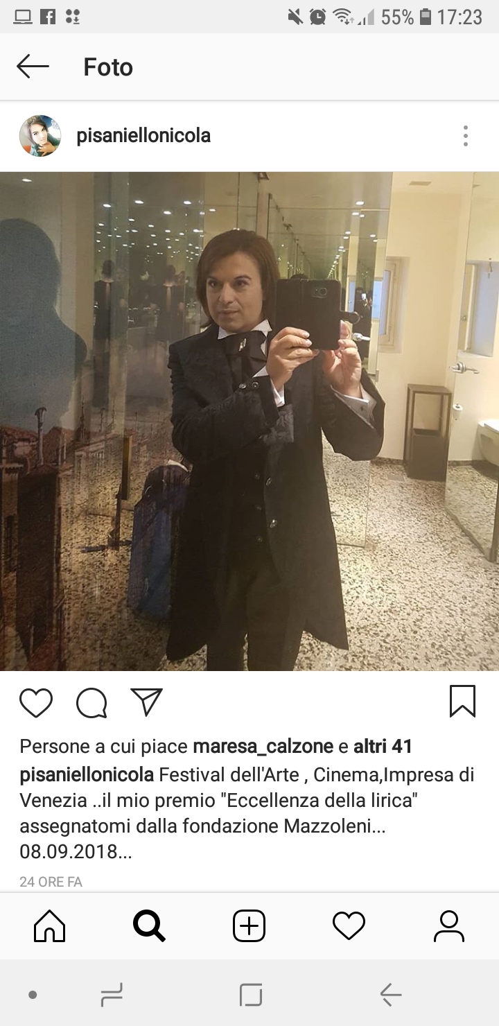 La sua voce è arrivata fino a Venezia, alla Mostra del Cinema per la precisione, dove ha ricevuto il tanto ambito Premio “Eccellenza della lirica”. E’ emozionato il tenore caudino Nicola Pisaniello che attraverso i social network ha fatto sapere di aver ricevuto sabato 8 settembre il premio d’eccellenza della lirica nel mondo. Pisaniello ha regalato al pubblico presente l’opera “La furtiva lacrima” dall’elisir d’amore di Donizetti.