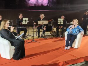 Nella suggestiva cornice del Teatro Romano, la Ricciarelli ha incantato i presenti con “Altro di me non le saprei narrare…”: uno spettacolo che, tra aneddoti, memorie e celebri pagine della lirica, ha ripercorso la sua straordinaria carriera. A presentare la serata, Silvia Bianculli; al pianoforte, il maestro Leonardo Quadrini, affiancato dal Quintetto Internazionale della Campania.