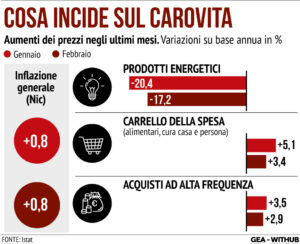 Nell’infografica GEA, su dati Istat, sono riportati gli aumenti dei prezzi nei mesi di gennaio e febbraio per tre ambiti: prodotti energetici, carrello della spesa e acquisti ad alta frequenza. In calo anche a febbraio i prezzi dell’energia (-17,2%), mentre cresce il carrello della spesa (+3,4%).