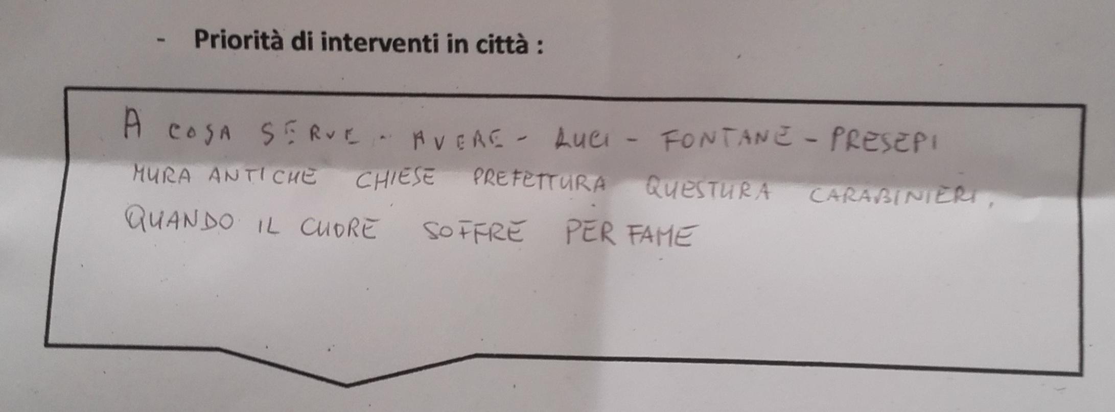Nati con l’intento di integrare il programma della #cittàditutti con proposte suggerite dai cittadini stessi, i primo dei presìdi dei giorni scorso ha permesso di raccogliere oltre 500 schede in cui sono state indicate le priorità e le esigenze che sentivano più impellenti utili a migliorare la nostra Città e la sua qualità della vita. Una fascia di età molto amplia, dai 18 ai 90 anni suddivisa equamente per genere si è lasciata coinvolgere dall’iniziativa e, dall’analisi dei questionari, è emersa in particolare l’esigenza dei beneventani di avere luoghi verdi di aggregazione, politiche che incentivino il turismo, attività volte ad aumentare i posti di lavoro; ma anche una pulizia maggiore della città, la riqualificazione delle strade e un controllo costante dei fiumi. Particolarmente rilevanti le denunce sulla situazione rifiuti e la necessità di una città più pronta a rispondere alle esigenze di chi vive in condizione di disabilità. I cittadini hanno confermato inoltre, in queste prime due giornate di confronto diretto e personale, la necessità di intervenire per ridare lancio alle attività commerciali, l’assoluto bisogno di cultura, negato anche dalla chiusura di luoghi deputati come il Teatro Comunale. Infine molta attenzione viene rilevata sul tema del coinvolgimento dei giovani, spesso obbligati a rinunciare ai loro sogni, non trovando intorno a sé nulla che li può aiutare a realizzare le loro idee. I #PresìdidellAscolto hanno quindi confermato e sicuramente arricchito l’attenta analisi di partenza della situazione di Benevento già fatta nel Progetto di Città presentato alla stampa nei giorni scorsi.