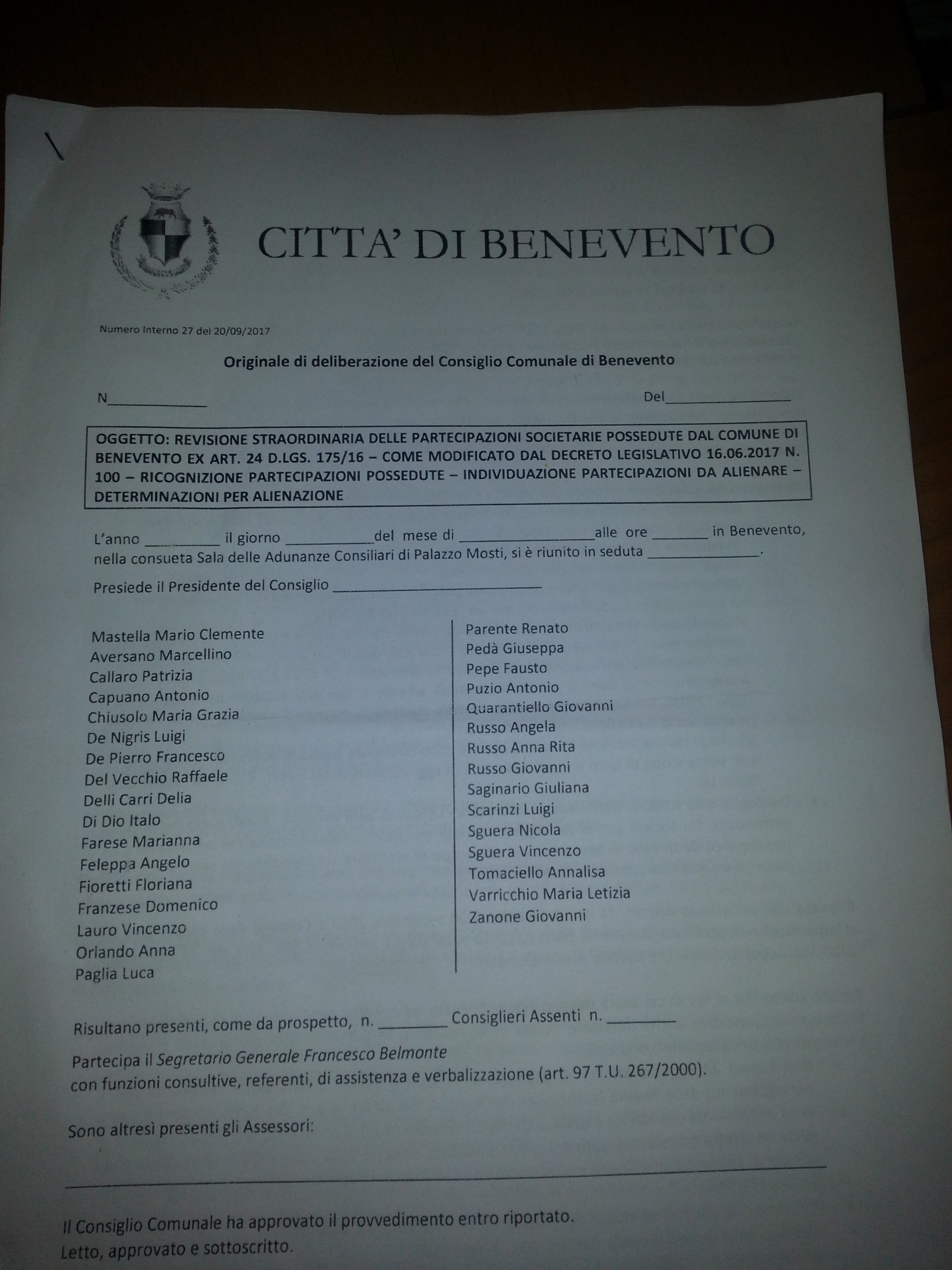 Un riferimento che l’opposizione ritiene essere assente nel documento di riferimento. Una situazione delicata che se non dovesse registrare il fallimento di Amts porterebbe al ribaltamento dell’attuale fase contingente ma restituirebbe una società di trasporto simile ad una scatola vuota e proporrebbe di nuovo il problema dei dipendenti che tornerebbero a non avere un futuro. E’ il tasto su cui si basano le argomentazioni della Giunta e del Sindaco secondo il quale, in caso di sentenza di riabilitazione di Amts, tutto si concentrerà sulla gara regionale in vista del 2018. La minoranza liquida come irresponsabile l’atteggiamento dell’Amministrazione. “Con la delibera votata l’amministrazione Mastella ha sancito in maniera definitiva la morte dell’Amts. Lo ha fatto nonostante le sorti di Amts siano ancora legate ad un giudizio che pende dinanzi la Suprema Corte di Cassazione. Se dovesse essere confermata la revoca della sentenza dichiarativa di fallimento, mantenere la partecipazione azionaria in Amts avrebbe significato ritrovarsi nuovamente a disporre di un’azienda in bonis. Ma oggi il Comune di Benevento ha deciso di liberarsi definitivamente dell’Amts, ed è una responsabilità che si deve accollare e che non può più demandare alle passate amministrazioni”.