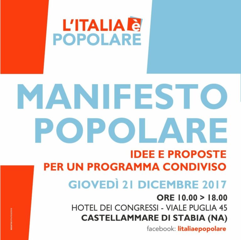 Oramai appare sempre più chiaro che con lo scioglimento delle camere, ovvero probabilmente  in coincidenza con l’inizio del nuovo anno, la  campagna elettorale entrerà nel vivo. I partiti sono in piena fase organizzativa e si susseguono manifestazioni ed incontri mirati a dare concretezza e visibilità ai singoli progetti. Una delle più recenti sigle apparse nel variegato panorama già esistente è quella che fa capo a Giuseppe De Mita : L’italia è popolare . Oggi infatti, dopo numerosi altri appuntamenti susseguitisi nelle ultime settimane, i simpatizzanti del “Manifesto popolare” si incontreranno presso l’Hotel dei Congressi di Castellammare di Stabia. I lavori saranno aperti proprio da Giuseppe De Mita  cui seguiranno gli interventi di Luigi Cobellis, Giuseppe Del Giudice, Biagio Iacolare, Raffaele Lanni, Nello Palumbo e Lia Pennitti. Il tema prescelto prevede un confronto a più voci sulle possibili proposte per la costruzione di un programma condiviso. Nel pomeriggio, invece, si affronterà un nuovo argomento legato alle problematiche turistiche e culturali della regione Campania. A relazionare saranno Corrado Matera, Maurizio Petracca e Maria Ricchiuti. Le conclusioni dei lavori saranno affidate a Ciriaco De Mita. La nuova aggregazione ,come ben noto, è nata di recente anche come risposta alla forzatura dell’Onorevole Cesa che senza una chiara deliberazione del congresso ha posizionato l’UDC  nell’alveo del centrodestra. Giuseppe De Mita ha scelto di dare una risposta in termini di contenuti ad un’azione considerata non in linea con i principi di riferimento del partito.