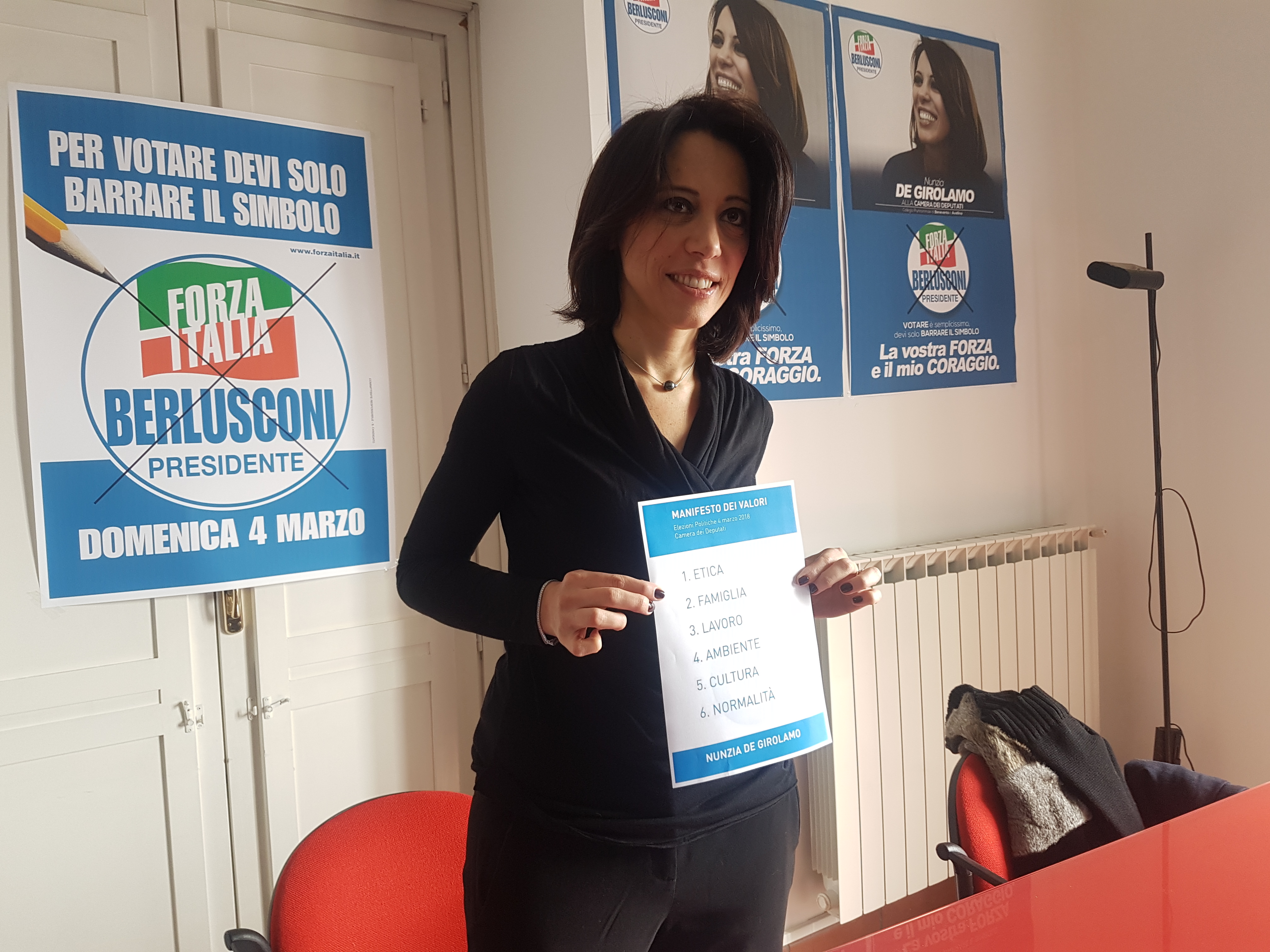 “Questa campagna elettorale – ha dichiarato – è iniziata con delle promesse, a me non interessano le promesse, interessano i valori. Valori che valgono al Nord, al Sud e al Centro del nostro fantastico paese. E’ per questo che ho deciso di presentare una Carta dei Valori, la Carta dei Valori di Nunzia De Girolamo.”