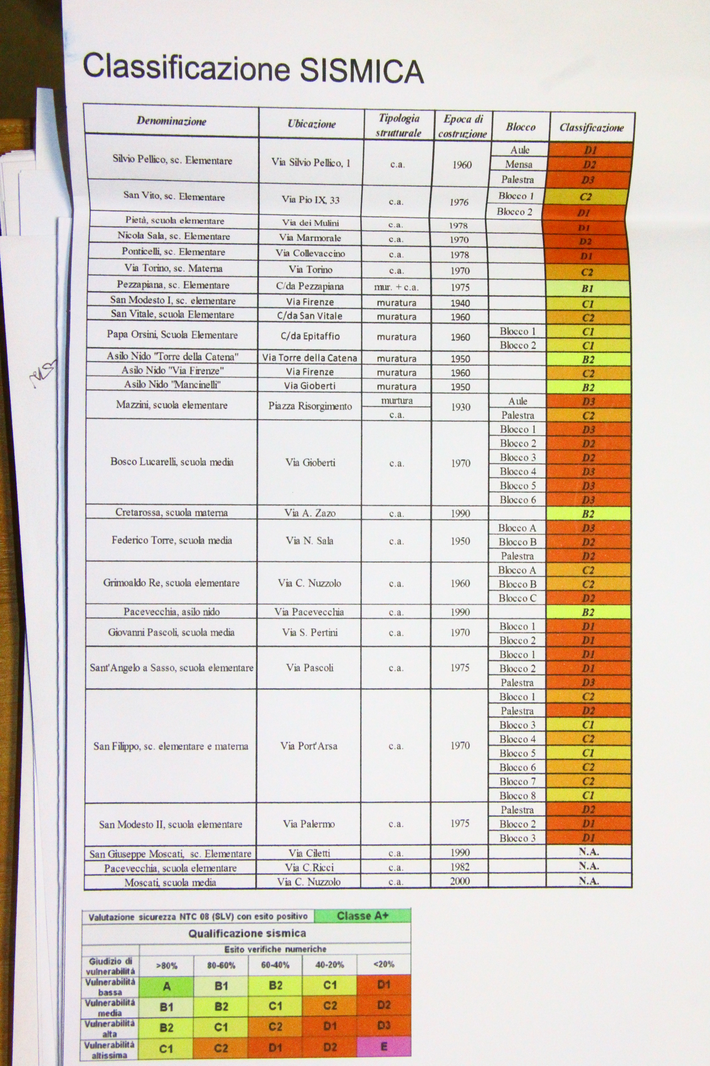 4) Dando uno sguardo alla relazione del dirigente Perlingieri che accompagna l’ordinanza sindacale per la chiusura della Silvio Pellico e della Lucarelli non si capisce per quale motivo non siano stati presi analoghi provvedimenti di chiusura per altri edifici scolastici che hanno gli stessi parametri di vulnerabilità sismica . San Filippo : valori compresi tra 0.18/0.3 tempi di intervento <2 anni , URGENTE. F. Torre : valore 0,33 tempo <2,1 anni si prevede demolizione e ricostruzione N.Sala : valori 0,33 tempo 2,1anni Ci sono elementi non verificati per carichi verticali al taglio. Da demolire e ricostruire
