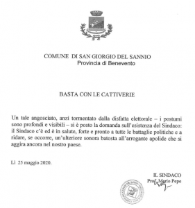 E meno male che bisognerebbe smetterla con le cattiverie!!! Da parte mia, nei giorni scorsi, vi sono state critiche legittime ed argomentate alla sua attività di sindaco. Nessuna offesa e nessun insulto, come tutti hanno potuto leggere sulla stampa. La reazione del sindaco è stata questa (cfr. nota), con l’aggravante di utilizzare il sito ufficiale del Comune, che certo non è il luogo adatto per fare propaganda e tanto meno insultare gli avversari, a cui vorrebbe addirittura togliere la cittadinanza. Veramente viene da chiedersi se tutto ciò possa essere considerato normale…”
