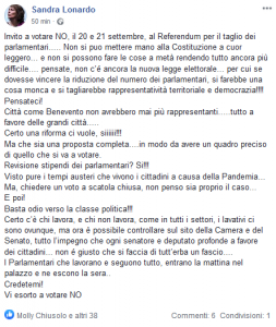 “Invito a votare NO, il 20 e 21 settembre, al Referendum per il taglio dei parlamentari….. Non si puo mettere mano alla Costituzione a cuor leggero… e non si possono fare le cose a metà rendendo tutto ancora più difficile…. pensate, non c’é ancora la nuova legge elettorale… per cui se dovesse vincere la riduzione del numero dei parlamentari, si farebbe una cosa monca e si tagliarebbe rappresentatività territoriale e democrazia!!!!  Pensateci!  Città come Benevento non avrebbero mai più rappresentanti…..tutto a favore delle grandi città…..