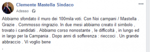 “Abbiamo sfondato il muro dei 100mila voti. Con Noi Campani / Mastella . Grazie. Commosso ringrazio. In due mesi abbiamo creato il simbolo , trovato i candidati . Abbiamo corso nonostante , le difficoltà , in lungo ed in largo per la Campania . Dopo anni di sofferenza : rieccoci . Un grande abbraccio . Vi voglio bene.” Cosi il sindaco di Benevento Mastella.