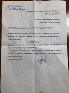 Arriva l’ufficializzazione per quanto attiene al gruppo consiliare ex Forza Italia. Il capogruppo Nanni Russo fa sapere che è stata depositata la nuova denominazione “Noi Campani per Mastella”.  I componenti il gruppo, Antonio Capuano, Mila Lombardi e Giuliana Saginario riconoscono nel Dottor Russo il capogruppo della compagine consiliare restando invariate le rispettive  competenze alle varie commissioni consiliari