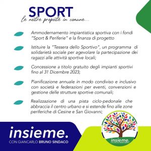 Il primo passo da compiere sarà il censimento di tutte le strutture sportive comunali con la pianificazione di un intervento di ammodernamento, sfruttando anche i fondi “Sport & Periferie” e la finanza di progetto, che ci permetterebbe di ridare nuovo lustro a tutta l’impiantistica comunale.