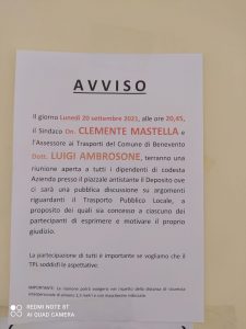 “Sembra che stasera, alle ore 20.45, “…il Sindaco Clemente Mastella e l’Assessore ai Trasporti del Comune di Benevento, Luigi Ambrosone, terranno una riunione aperta a tutti i dipendenti della Trotta Bus presso il piazzale antistante il Deposito ove ci sarà una pubblica discussione su argomenti riguardanti il Trasporto Pubblico Locale, a proposito dei quali sia concesso a ciascuno dei partecipanti di esprimere e motivare il proprio giudizio”. Così reciterebbe un avviso diramato a tutti i dipendenti della “Trotta bus”.