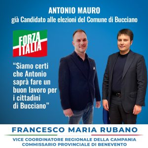 “Bucciano sarà al centro della nostra agenda politica e programmatica. Sono sicuro che l’amico Antonio Mauro saprà offrire un impegno serio nell’ottica di restituire, insieme ad ogni altro esponente di Forza Italia, un nuovo cammino di crescita e credibilità per le realtà del nostro Sannio”-. Queste le parole del Vice Coordinatore regionale della Campania e Commissario provinciale di Forza Italia, Francesco Maria Rubano.
