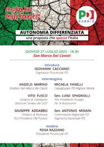 L’evento si colloca nell’ambito delle iniziative dell’Estate Militante che il PD Sannita sta attuando sul territorio provinciale.
