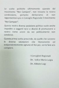 Ciò che si paventava ma che era ampiamente gia’ effettivo ora assume i connotati della ufficialità. Gino Abbate e in misura maggiore Maria Luigia Iodice abbandonano Noi di Centro. Affidano la loro decisione ad un comunicato nel quale si legge che “le scelte operate dal movimento Noi Campani non trovano la nostra condivisione e pertanto non rappresentiamo più in Consiglio Regionale detto movimento.