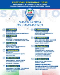 Il 26 agosto a Torrecuso con la riunione del coordinamento Valle Vitulanese; il 1 settembre, a Paduli con l’incontro del coordinamento Val Fortore; il 2 settembre, a Fragneto Monforte con la riunione del coordinamento Valle del Tammaro; il 3 settembre, a San Salvatore Telesino con la riunione del coordinamento Valle Telesina; il 4 settembre, a Montesarchio con la riunione del coordinamento della Valle Caudina; il 5 settembre, a San Giorgio del Sannio con la riunione del coordinamento della Valle Medio Calore.