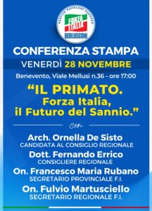 “Il Primato. Forza Italia, il Futuro del Sannio”: è questo il titolo della conferenza stampa organizzata dal partito azzurro venerdì 28 novembre, alle ore 17, in viale Mellusi n. 36 a Benevento.