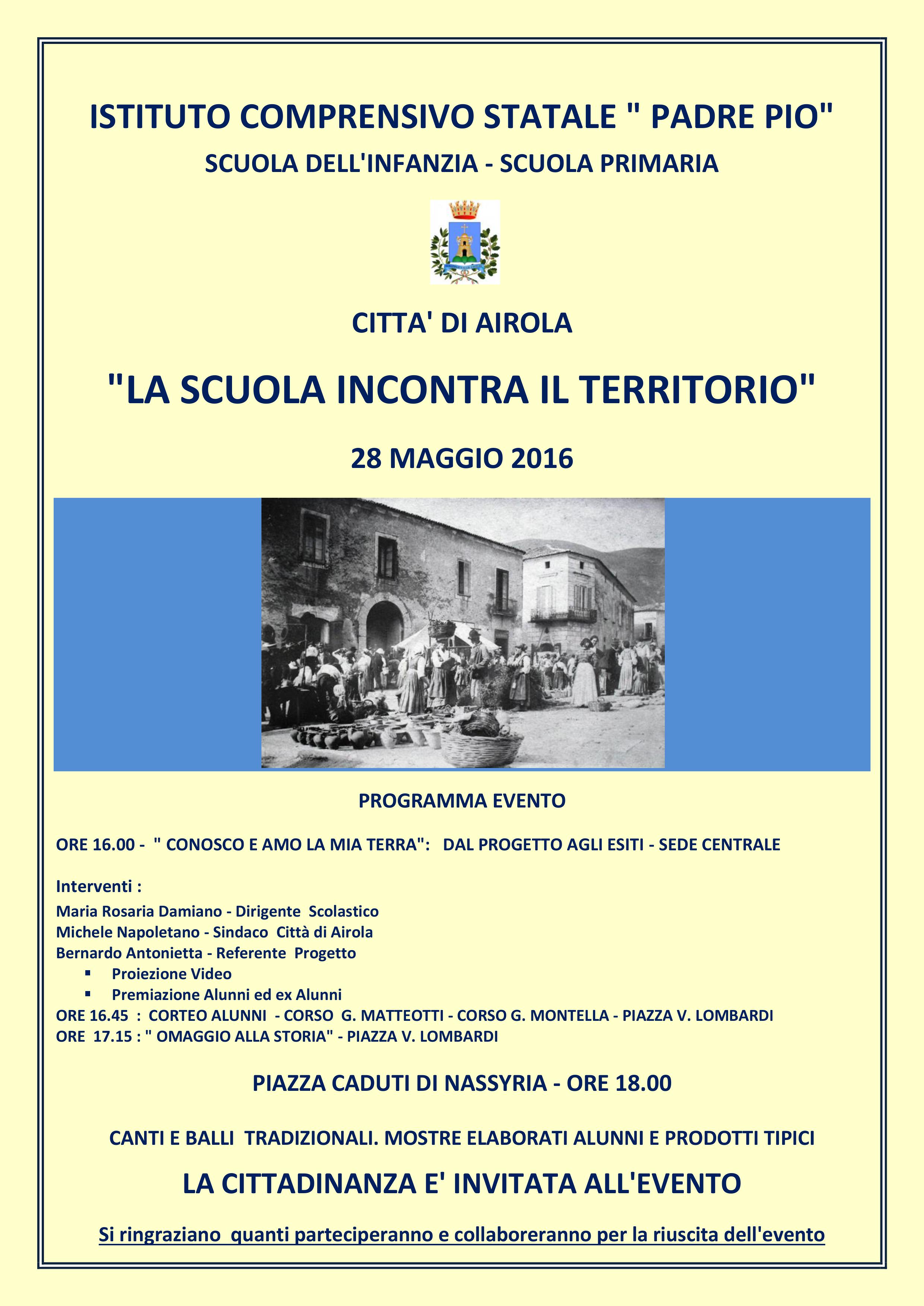AIROLA- L’Istituto Comprensivo Statale “Padre Pio”  a conclusione del progetto “Conosco e amo la mia Terra”, ha organizzato l’evento “La Scuola incontra il Territorio” per il giorno 28 maggio 2016, con un folto programma di iniziative e il coinvolgimento di tutti gli alunni, dei genitori e di associazioni culturali operanti sul Territorio: PRO LOCO AIROLA,AIROLANDIA, GI.CA.RA.,PAN DI ZUCCHERO,ANTER,UNASP ACLI PROGETTO MUSICA. Nel progetto sono stati coinvolti aziende e artigiani locali. I nonni degli alunni hanno tenuto aperte raccontando ai ragazzi il passato : tradizioni, storie di vita, abitudini, luoghi…