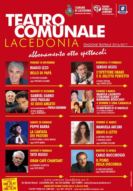 Presentato il cartellone 2016 – 2017 del Teatro Comunale. Anche nell’anno in corso la stagione ufficiale sarà posta in essere da tale Ente, nel cui direttivo siede Caradonna. In linea con le pregresse annualità, grandi nomi dello spettacolo a livello nazionale calcheranno il palcoscenico lacedoniese. Si comincia con Biagio Izzo, venerdì 18 novembre, il quale porterà in scena una esilarante commedia di Vincenzo Salemme, che ne cura anche la regia: “Bello di papà!”. Un singolarissimo connubio di attori si esibirà invece il 27 di dicembre: il sipario si aprirà su un mostro sacro del teatro italiano, il celeberrimo Ugo Pagliai, affiancato dall’idolo dell’immaginario femminile Gabriel Garko, con la partecipazione, come se non bastasse, di Paola Gassman, figlia d’arte del grandissimo Vittorio. Ancora, il 28 gennaio, Peppe Barra proporrà uno dei suoi più riusciti cavalli di battaglia, ovvero la celebre “Cantata dei Pastori”, mentre il 9 febbraio tornerà l’esilarante Tato Russo con il pluripremiato spettacolo “Gran Cafè Chantant”. Sergio Assisi, altro idolo femminile, sarà il protagonista della commedia “L’Ispettore Drake e il delitto perfetto” il 19 di febbraio. Venerdì 3 marzo grandissimo evento con grandi protagonisti della commedia all’italiana che ha caratterizzato decenni del cinema nazionale. Nella commedia “Quattro donne e una canaglia” saranno insieme sul palco Gianfranco D’Angelo, Corinne Clery e Barbara Bouchet, due attrici che hanno tolto il sonno a diverse generazioni di maschietti italiani. Ma ci sarà anche la simpatia di Marisa Laurito e l’avvenenza non scevra di autentica bravura della giovane Paola Caruso. Il 31 di marzo la bellezza muliebre ancora protagonista, con Manuela Arcuri che si esibirà nella commedia “Bravi a letto”. Dulcis in fundo altro ritorno, atteso e in qualche maniera preteso dagli abbonati, quello di Carlo Buccirosso, autore, regista e protagonista della commedia “Il Pomo della Discordia”.