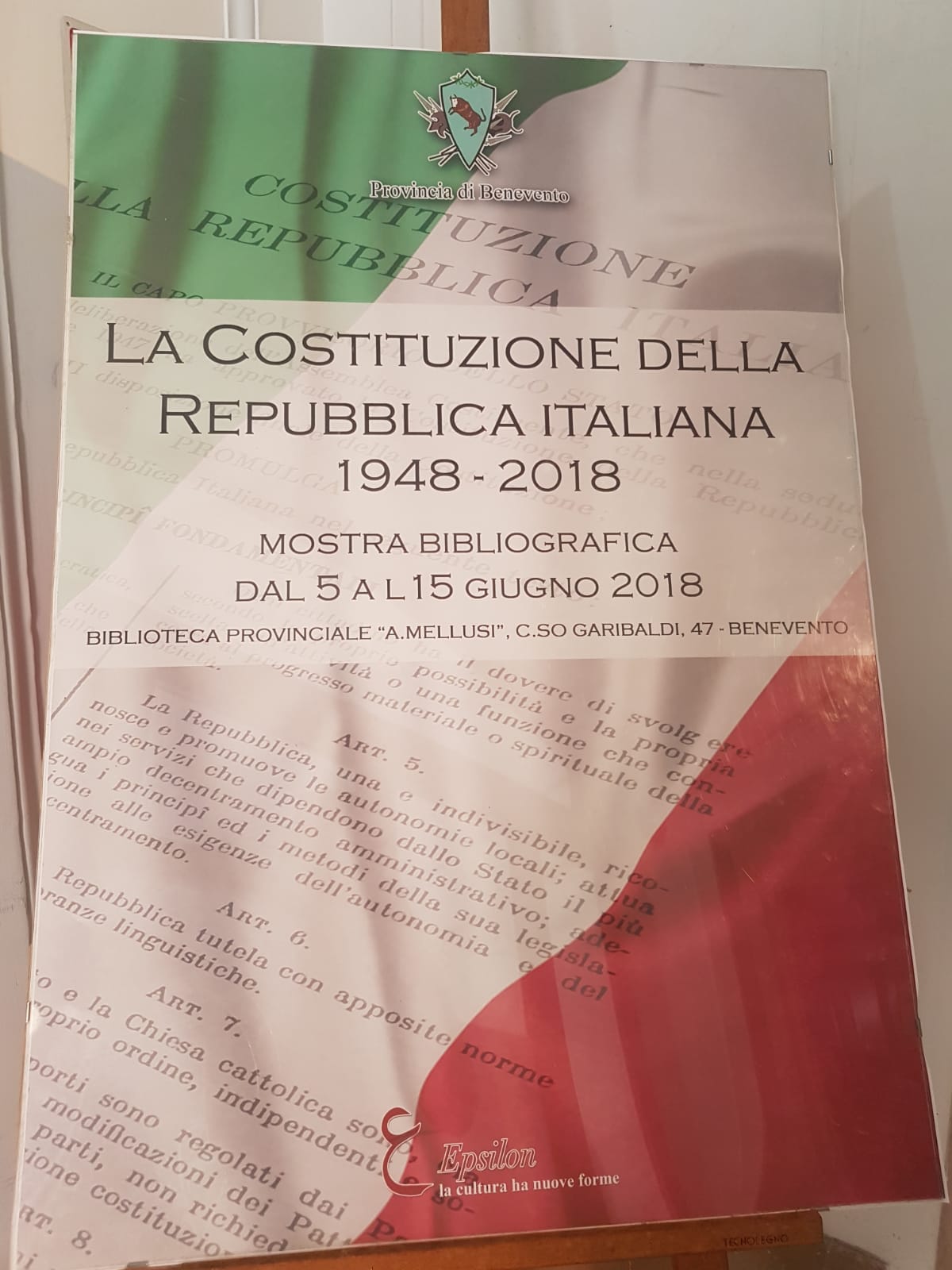Una vasta esposizione di pannelli esplicativi di alcune parti della Costituzione e cioè i 12 Principi fondamentali (gli articoli dall’ 1 al 12) e quelli concernenti diritti e doveri dei cittadini Italiani (Parte I – Tit. da 1 a 4). In mostra i libri facenti parte del Patrimonio Moderno della Biblioteca Mellusi e sul Sannio con materiale emerografico e una Sezione dedicata ai Ragazzi, con un video proponente il discorso del Padre Costituente Piero Calamandrei sulla Costituzione Italiana. Messaggio importante dei curatori della mostra è quello di invogliare i cittadini a rileggere e a soffermarsi di più sulle parole e sul senso della carta costituzionale.