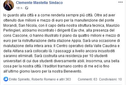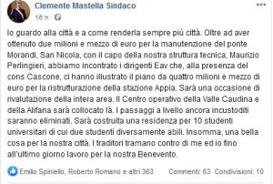 La notizia è giunta nella serata di lunedi ed è stata annunciata dal sindaco di Benevento Mastella dopo una giornata piena in Regione Campania. Due saranno gli interventi per la città di Benevento per un totale di 7 milioni. Di questi 2,5 sono destinati alla manutenzione ordinaria e al ripristino struttutale del ponte San Nicola, la somma restante al restyling della stazione Appia sulla Benevento Cancello. Il tutto è stato dichiarato via social dal sindaco di Benevento tramite un post sul suo profilo facebook: “Io guardo alla città e a come renderla sempre piu’ citta’” ha tuonato Mastella che inoltre ha parlato di “due milioni e mezzo necessari per il ponte Morandi”. A Napoli Mastella ha incontrato i tecnici della Eav alla presenza del consigliere regionale Cascone i quali hanno illustrato il piano per la ristrutturazione della stazione Appia. Un passaggio poi del primo cittadino sui passaggi a livello della Valle Caudina e della Alifana, “quelli incustoditi saranno infatti eliminati”. Infine, spazio al mondo universitario ” sarà costruita una residenza per 10 studenti universitari di due diversamente abili”. Per il Ponte San Nicola gli interventi dovranno essere effettuati nell’arco di 18 mesi, immediati da fare restano lo smaltimento, svuotamento acqua e  pulizia cassoni. Per la stazione Appia e operazioni dunque  si pongono come miglioramento del confort degli utenti e della qualità ambientale attraverso l’implementazione delle prestazioni energetiche e una corretta gestione delle risorse . L’intervento rientra nel programma “Smart Station” finanziamento nell’ambito delle risorse Por Campania Fesr 2014-2020 che vede Eav come soggetto attuatore per conto della Regione per un valore di 28 milioni.