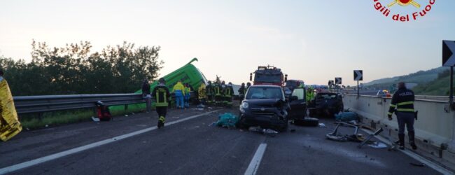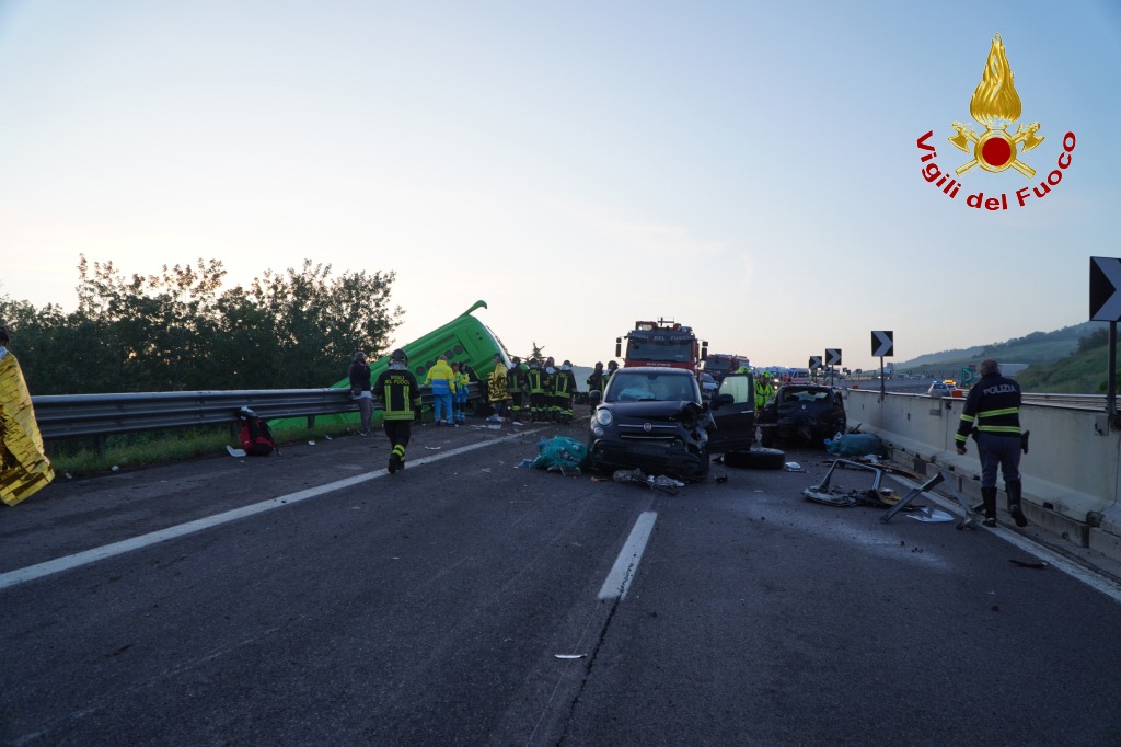 Il giorno dopo la tragedia sull’autostrada A16 che ha visto coinvolte 5 auto e un pullman della Flixbus si cerca di ricostruire la dinamica dei due incidenti avvenuti uno dei seguito all’altro, all’altezza del km 101 sul territorio di Vallesaccarda poco dopo la galleria, sulla carreggiata in direzione Napoli. Un doppio impatto che è costato la vita ad un giovane immigrato della Costa d’Avorio e il ferimento di altre 23 persone, delle quali una, il secondo autista del bus, ha subito l’amputazione di una mano fino all’avambraccio. Al lavoro gli agenti della sottosezione della Polstrada di Grottaminarda, agli ordini del comandante Armando Mirra, e coordinati dal Procuratore della Repubblica di Benevento Aldo Policastro e il sostituto Maria Chiara Marcaccio. Certosini i rilievi fotografici. E già ascoltati alcuni dei passeggeri insieme all’autista del mezzo della Flixbus, il 63enne Giuseppe Soave, rappresentato dall’avvocato Guerino Gazzella, che ha fornito piena collaborazione ed è stato sottoposto ad alcol e droga test risultando negativo. Oltre a tutti i veicoli coinvolti, poi, gli agenti hanno anche sequestrato il cronotachigrafo del bus per i dovuti accertamenti tecnici. Secondo una primissima ricostruzione dei fatti effettuata dagli inquirenti, poco più avanti dell’uscita della galleria, presumibilmente intorno alle 3 e mezza del mattino di domenica c’era già stato un incidente che aveva coinvolto 4 vetture nelle quali viaggiavano diversi immigrati con un carico di merce contraffatta, quasi tutti scappati dopo il sinistro. Non è ancora certo anche se appare probabile che l’uomo morto, sbalzato fuori dall’abitacolo nell’impatto, sia deceduto in seguito al primo tamponamento e non in conseguenza dell’urto violento con il pullman che, partito da Lecce e diretto a Roma, trasportava 36 passeggeri. In attesa di conferme, ciò che sembra trovare riscontro è il fatto che trovandosi un’auto sulla corsia a destra ferma e a luci spente, l’autista del bus ha cercato di evitarla, andando, però, a scontrarsi con una o due delle altre tre reduci dal primo impatto. Lo scontro ha fatto uscire di strada il mezzo che è finito nella sottostante scarpata, alta una decina di metri. La quinta vettura, invece, è sopraggiunta dopo gli altri due incidenti ma non avrebbe causato alcuna conseguenza. Intanto restano critiche le condizioni del giovane nordafricano rimasto ferito gravemente, in prognosi riservata nel reparto di rianimazione dell’ospedale “San Pio” di Benevento. Nello scontro ha rimediato contusioni e fratture anche un automobilista che viaggiava insieme alla fidanzata. Al giovane è stato “riallineato” il polso dai medici del pronto soccorso dello stesso nosocomio beneventano. Altri feriti ricoverati tra il Moscati di Avellino e il Frangipane di Ariano sono stati dimessi. Gli inquirenti procedono sull’ipotesi di reato di omicidio stradale e lesioni plurime.