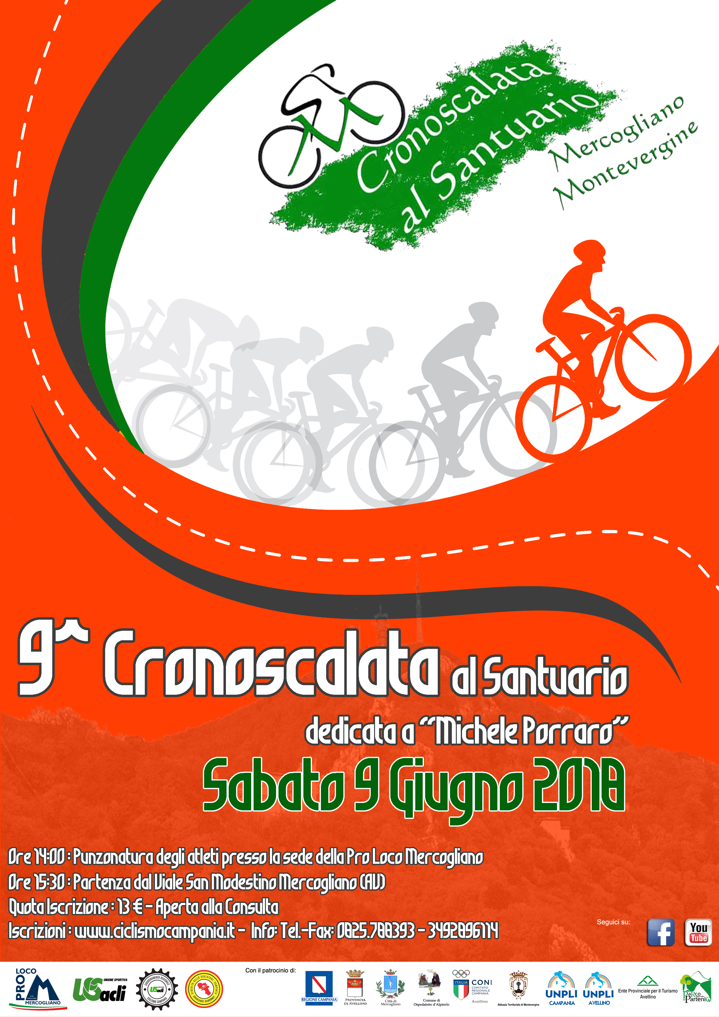 Si colora di arancione la IX Cronoscalata al Santuario Mercogliano – Montevergine, gara ciclistica a cronometro, che si correrà il prossimo 9 giugno a Mercogliano, annoverata tra gli appuntamenti a carattere regionale più attesi per gli appassionati delle due ruote, valevole, quest’anno, come prova del Circuito dello Scalatore Campania 2018 e dedicata al giovane scomparso Michele Porraro, ideatore della manifestazione, ciclista appassionato non solo di sport, ma anche della montagna di Montevergine e del suo territorio.