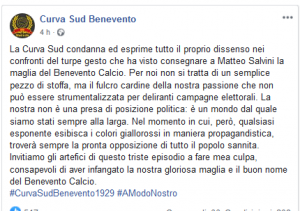 “La Curva Sud condanna ed esprime tutto il proprio dissenso nei confronti del turpe gesto che ha visto consegnare a Matteo Salvini la maglia del Benevento Calcio. Per noi non si tratta di un semplice pezzo di stoffa, ma il fulcro cardine della nostra passione che non può essere strumentalizzata per deliranti campagne elettorali. La nostra non è una presa di posizione politica: è un mondo dal quale siamo stati sempre alla larga. Nel momento in cui, però, qualsiasi esponente esibisca i colori giallorossi in maniera propagandistica, troverà sempre la pronta opposizione di tutto il popolo sannita. Invitiamo gli artefici di questo triste episodio a fare mea culpa, consapevoli di aver infangato la nostra gloriosa maglia e il buon nome del Benevento Calcio.”. Cosi la Curva sud Benevento su Facebook.