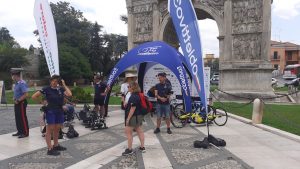Presenti all’Arco di Traiano i rappresentanti della “Fondazione Michele Scarponi”, la fondazione nata per volontà della famiglia Scarponi dopo la morte del campione marchigiano di ciclismo Michele Scarponi avvenuto nel 2017 proprio in seguito ad un incidente stradale.