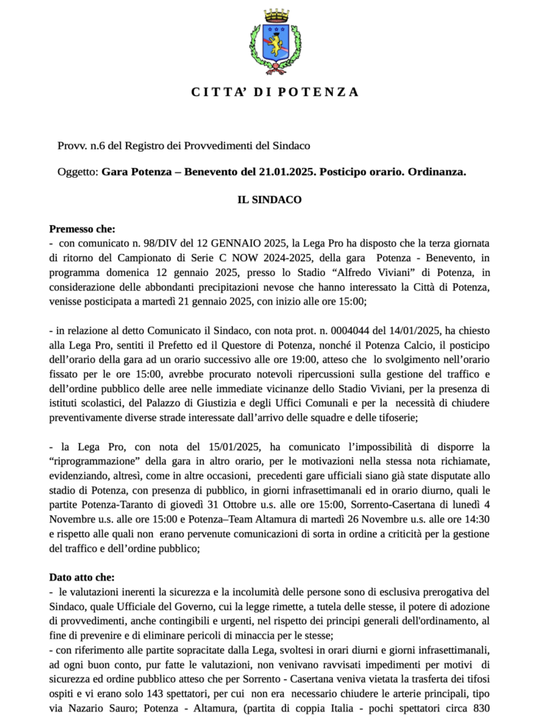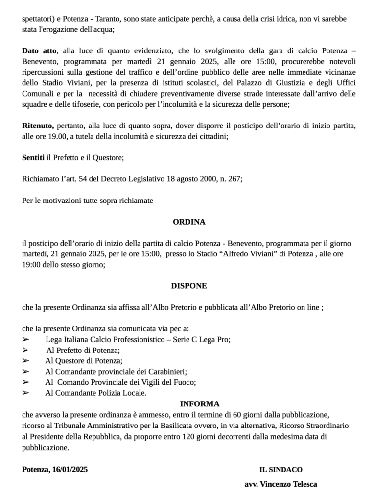 Potenza-Benevento si giocherà martedì 21 gennaio alle ore 19:00 e non più alle ore 15 come precedentemente come concordato. E’ quanto emerge dalla decisione presa dal sindaco di Potenza, Vincenzo Telesca, attraverso apposita ordinanza. Dopo aver infatti incassato il parere sfavorevole da parte di Lega e delle due società di calcio, il primo cittadino ha scelto comunque di disporre un’ordinanza per il posticipo della gara alle ore 19:00, motivando la scelta poiché l’orario delle 15:00 “procurerebbe notevoli ripercussioni sulla gestione del traffico e dell’ordine pubblico delle aree nelle immediate vicinanze dello Stadio… e per la necessità di chiudere preventivamente diverse strade interessate dall’arrivo delle squadre e delle tifoserie, con pericolo per l’incolumità e la sicurezza delle persone“.