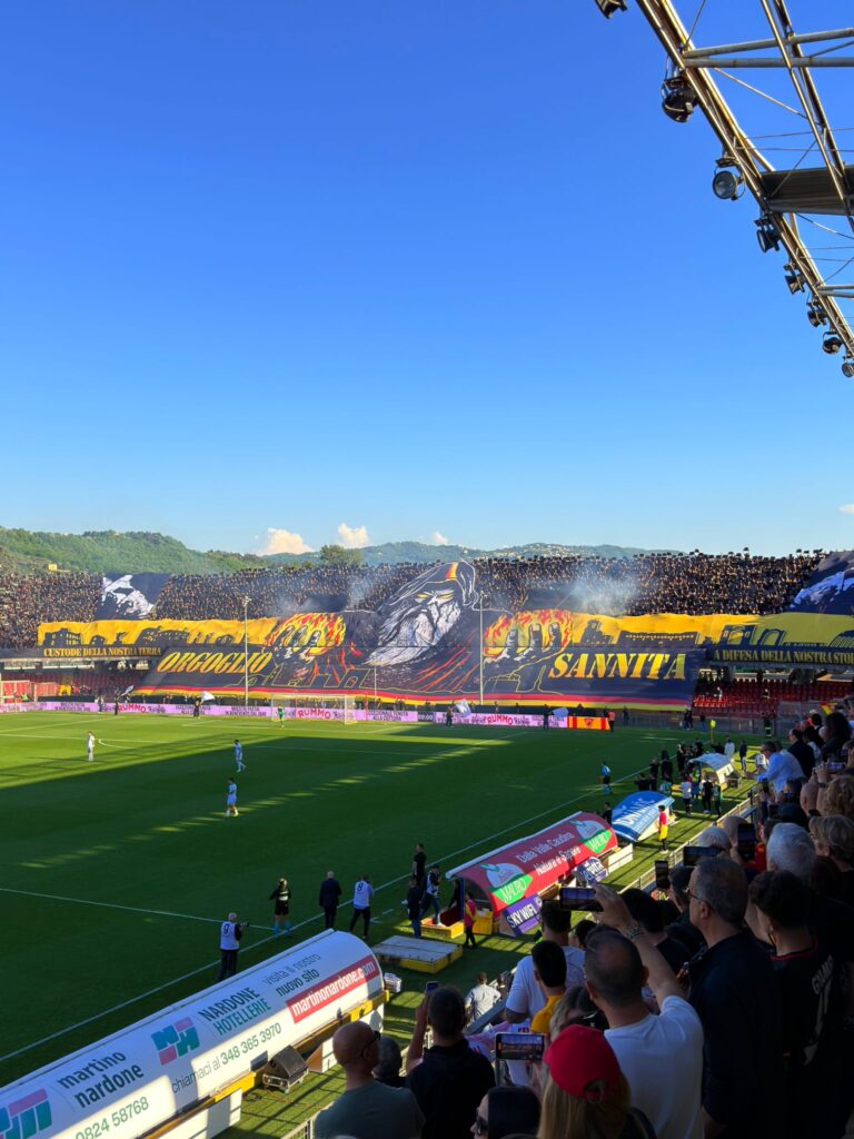 E’ il tempo di festa, lo spettacolo parte dagli spalti. Lo Stregone si erge sulla curva, è la bellissima coreografia della Curva Sud che tributa il Benevento che torna in Serie B. Sul campo finisce con un pareggio il campionato della squadra sannita, che per due volte va in vantaggio, ma altrettante viene ripresa dall’Audace. Ad aprire le danze nel primo tempo è Mignani, con la solita rapacità che gli permette di centrare il gol numero 10 e portando a 4 il numero di attaccanti a doppia cifra in casa giallorossa. Benevento che non è sempre solido come ha abituato, complici le rotazioni ed un ovvio inconscio rilassamento, ci mette 9 minuti appena Gambale a siglare il pareggio. Nella ripresa la squadra di casa parte con una marcia in più ed è Davide Lamesta a rimettere la freccia. Dietro però la squadra rischia, le parate super di Esposito tengono finché possono, senza poter intervenire al minuto 78 quando ancora Gambale infila la rete, siglando il definitivo 2-2. Non cambia nulla per la Strega, che si gode l’abbraccio del suo popolo, il trionfo di un’annata che resta nella storia. Il Benevento saluta la C, la speranza di non scivolare più nell’inferno calcistico.