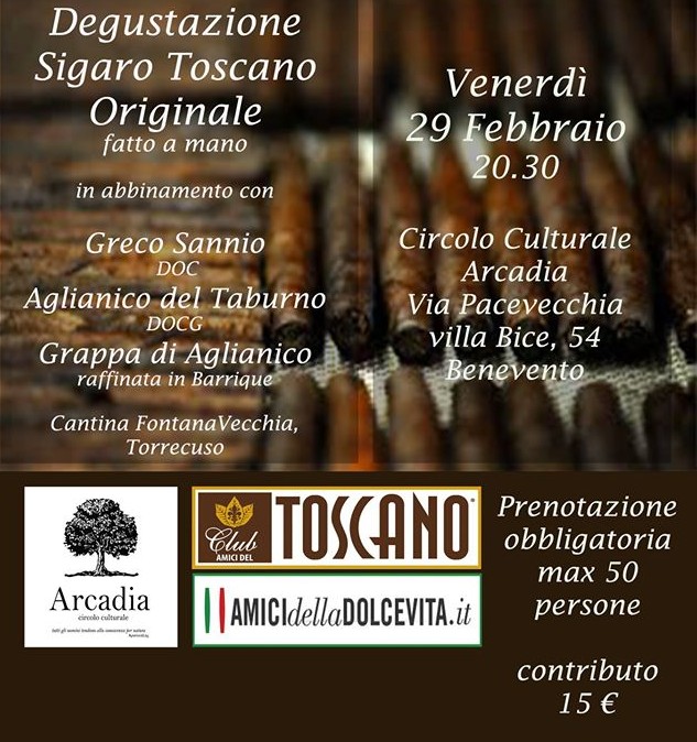 Il circolo Arcadia in collaborazione con il Club Amici del Sigaro Toscano ed il Club Amici della Dolce Vita organizza, per venerdì 19 febbraio, una degustazione di Sigaro Toscano, partendo da un prodotto di alta gamma:...