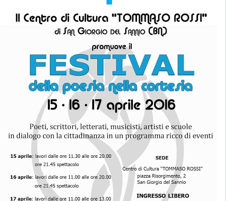 È stato definito il programma del Festival della poesia nella cortesia che si svolgerà a San Giorgio del Sannio (Bn) il 15, 16 e 17 aprile prossimi. Il prestigioso evento, coordinato dalla poetessa Rita Pacilio, è promosso dal...
